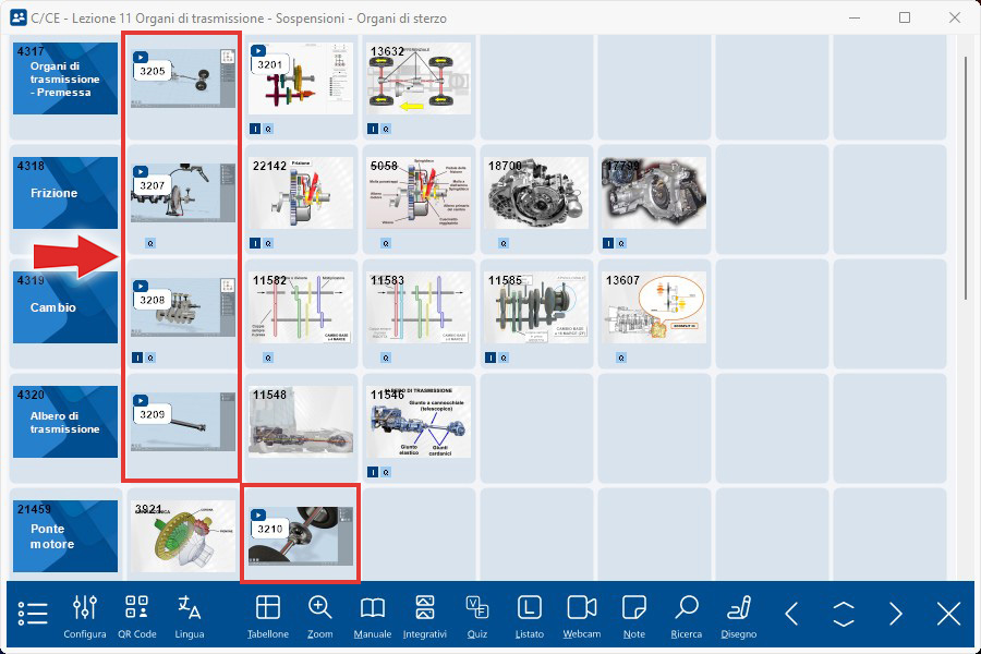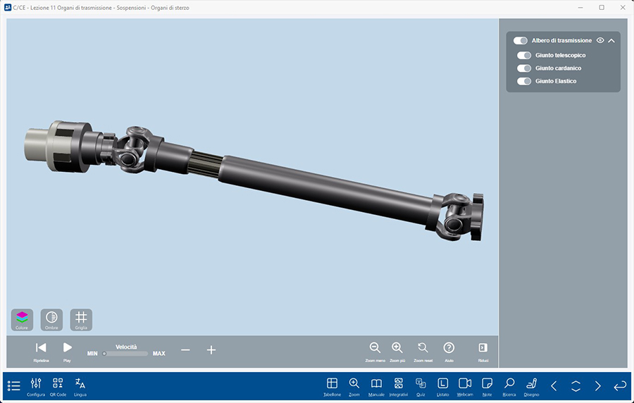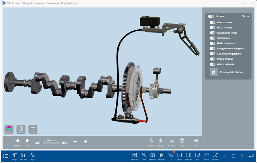 Si tratta di un vero e proprio simulatore 3D degli elementi della trasmissione e del motore che il docente può utilizzare in modo interattivo per spiegare il funzionamento di questi elementi del veicolo e per mostrare le concatenazioni tra i vari componenti.